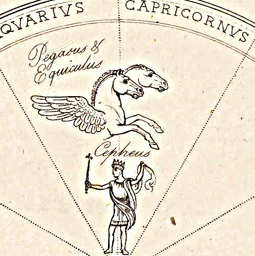 Les figures symboliques de cette dernière constellation, placées à cheval sur la limite des signes du Capricorne et du Verseau, indiquent ainsi le rapport d’inséparabilité de ces deux signes. Dans le Verseau se trouve la figure du roi Céphée, tenant le sceptre aux trois pointes, au-dessus duquel se voient la tête, et le poitrail d’un cheval ailé, ainsi que de la tête d’un autre cheval nommés respectivement Pégase et Equiculus. Un commentaire détaillé de ces symboles sera donné au chapitre du Verseau, mais il est d’ores et déjà évident que Céphée est l’homme accompli, l’homme du Verseau : RUBEN, dont le texte biblique dit :