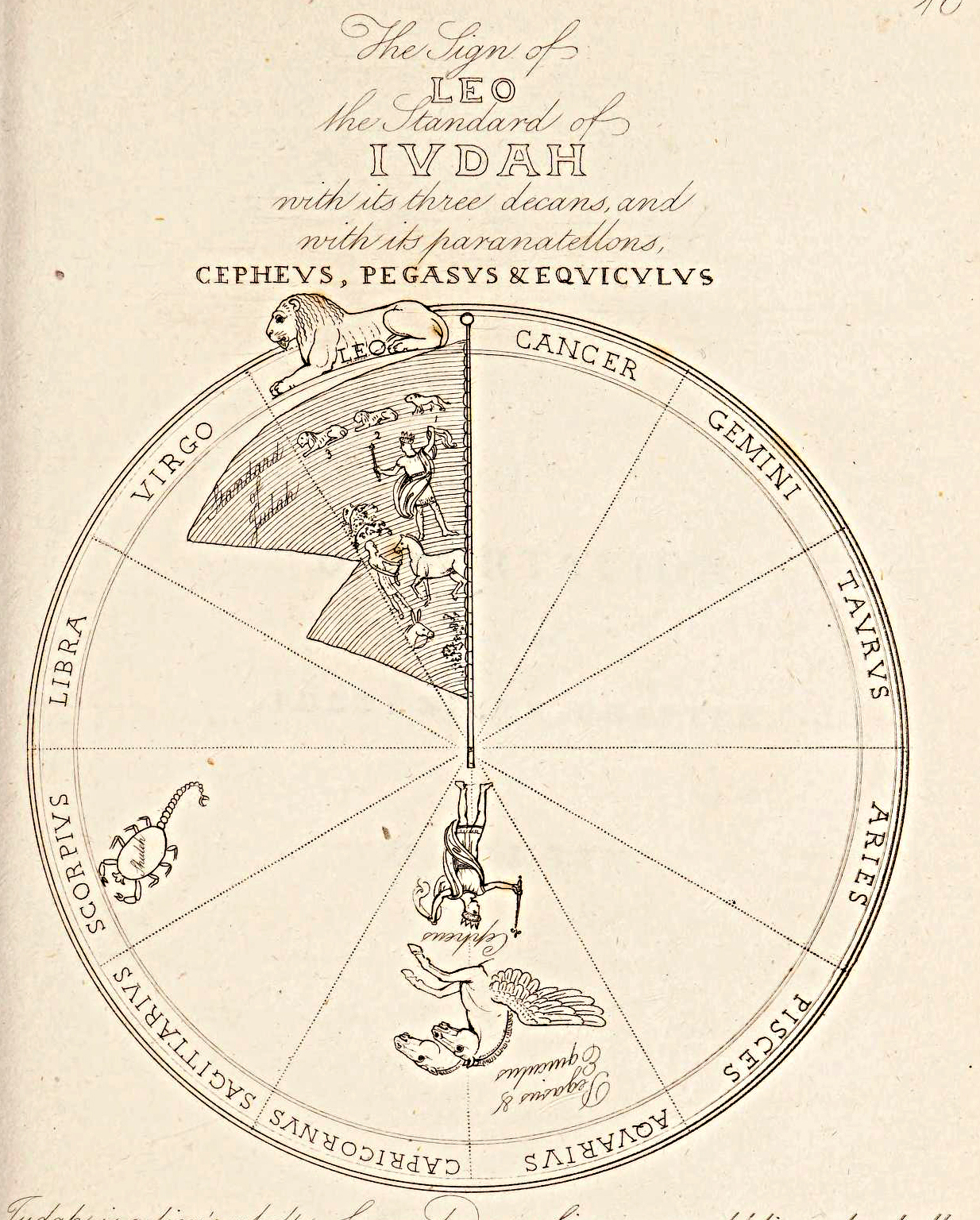 La correspondance des tribus d’Israël avec les signes du Zodiaque attribue à Juda le signe du Lion. Drummond figure ce signe avec ses décans, et ses paranatellons tels qu’ils étaient représentés, dit-il, par les Juifs, les Égyptiens, les Perses et d’autres astronomes orientaux. Les paranatellons d’un signe étaient les constellations qui se levaient à l’horizon ou au méridien en conjonction avec, ou en opposition à ce signe. Les astronomes orientaux attachaient une grande importance en astrologie aux décans des signes, ainsi qu’à leurs paranatellons. Selon eux, la signification de ces éléments éclairait et complétait celle du signe. Il est donc intéressant d’examiner le Lion de Juda sous ce rapport. La figure zodiacale de Drummond représentant «l’Étendard de Juda », contient, outre les figures des trois décans du Lion, celles de ses paranatellons, c’est-à-dire celles des constellations du Scorpion, du Capricorne et du Verseau, ainsi que les noms des constellations de Céphée, de Pégase et d’Equiculus.