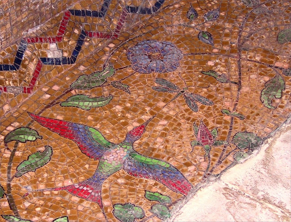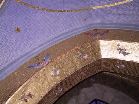 Deux types d’incrustation décorent cet arc. Sur la partie touchant la mosaïque bleue se déploient sept têtes d’anges. Chacun d’eux est couronné par un symbole planétaire ou métallique. En majesté, à la cime de la voûte, s’inscrit un rond rouge vif et à centre apparent, marqué par un point, symbole du soleil et de l’or. De part et d’autre il est entouré des autres planètes ou métaux. Partons de bas à gauche où se trouve la lune. Puis Mars et Vénus montent vers le soleil. A sa droite redescendent Jupiter, Mercure et Saturne.