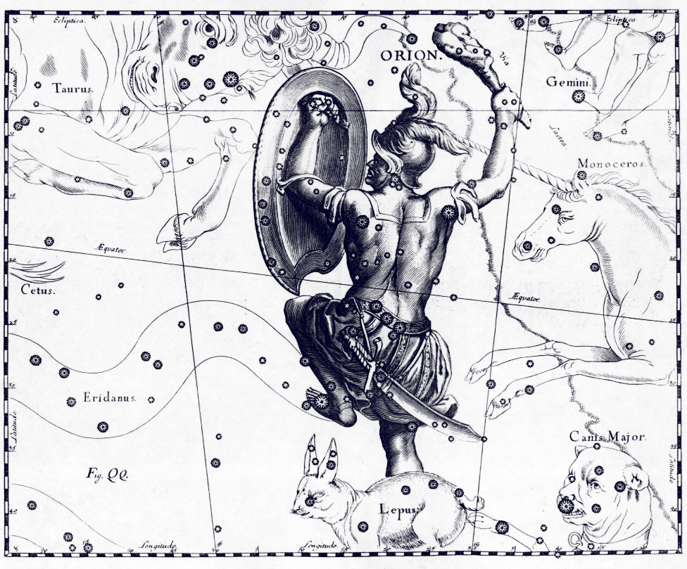 Le géant Orion ne fait pas partie des 12 constellations du Zodiaque, mais il touche le cercle, comme si la figure marchait à proximité, la figure semble marcher sur l’eau et traverser le fleuve de la constellation Eridan (Eridanus) qui doit son nom à un fleuve de la mythologie grecque. A gauche d’Orion il y a un grand ruban pâle qui monte dans le ciel, c’est la Voie Lactée, notre galaxie, un autre fleuve dans le ciel.