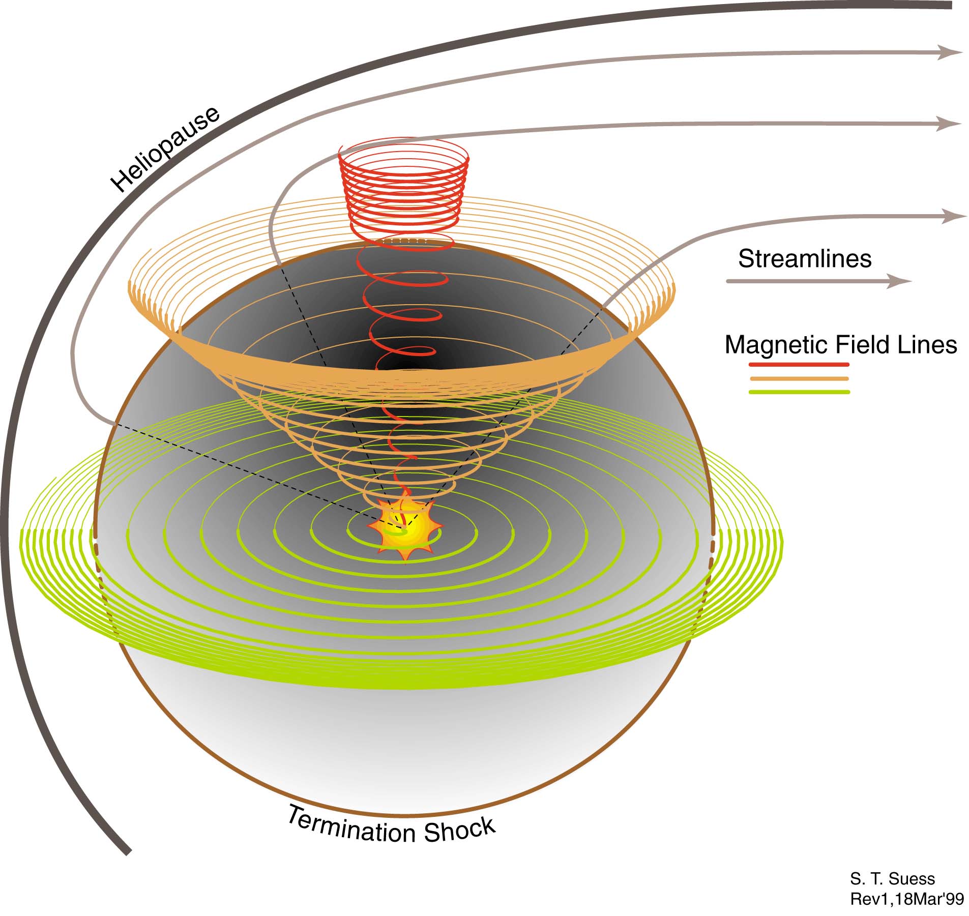 Dans le cas du soleil, des particules ionisées (électrons, protons, ions hélium) s’échappent et constituent le vent solaire. Loin du soleil, les lignes de champ magnétique sont alignées à peu près sur les courants du vent. Elles sortent par l’hémisphère nord du soleil et rentrent pas l’hémisphère sud. Les deux régions ont séparées par un plan équatorial dénommé la nappe de courant neutre ou de courant héliosphérique.