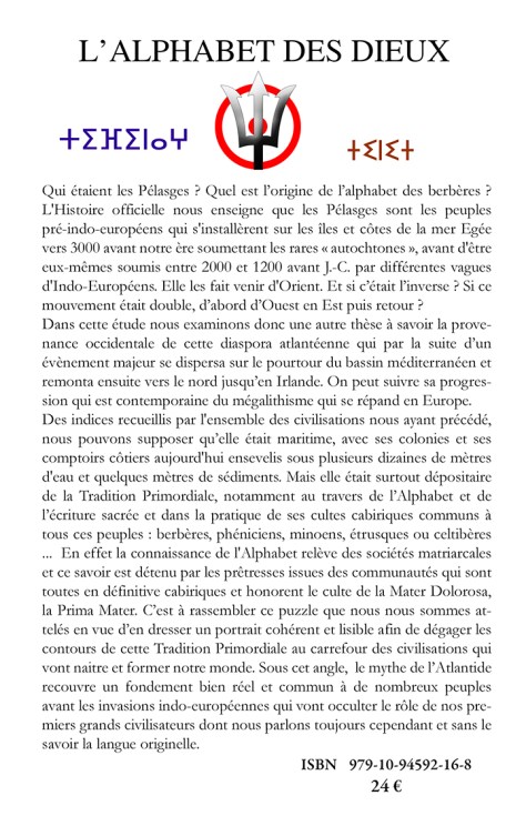 « Depuis ces ancêtres Maglemosiens ou Hambourgeois, une grande civilisation maritime se créera en Mer du Nord et ce sont très probablement ceux que Platon appelait les Atlantes ou peuple d’Atlas. Les“émigrant” (Wandel) – ceux de leurs cousins condamnés à “voyager” comme des grues ou des cigognes, par la pression démographique ou (et) les modifications climatiques, voire de récurrentes montée des eaux s’installent dans les grandes îles de la Méditerranée sous le nom de Pélasges !