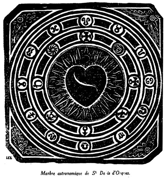 En parlant, à propos de « la lumière et la pluie », des représentations du soleil avec des rayons alternativement rectilignes et ondulés, nous avons signalé que ces deux sortes de rayons se retrouvent aussi, d’une façon toute semblable, dans certaines figurations symboliques du cœur ; un des exemples les plus intéressants qu’on puisse en donner est celui du cœur figuré sur un petit bas-relief de marbre noir, datant apparemment du XVIe siècle et provenant de la Chartreuse de Saint-Denis d’Orques, qui a été étudié autrefois par L. Charbonneau-Lassay (1). Ce cœur rayonnant est placé au centre de deux cercles sur lesquels se trouvent respectivement les planètes et les signes du Zodiaque, ce qui le caractérise expressément comme le « Centre du Monde », sous le double rapport du symbolisme spatial et du symbolisme temporel (2) ; cette figuration est évidemment « solaire », mais, d’ailleurs, le fait que le soleil, entendu au sens « physique », se trouve lui-même placé sur le cercle planétaire, ainsi qu’il doit l’être normalement dans le symbolisme astrologique, montre bien qu’il s’agit proprement ici du « Soleil spirituel ».