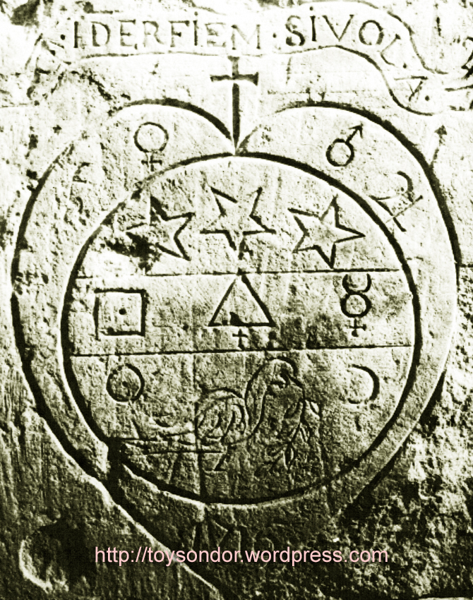 A la différence du marbre de St-Denis d’Ourques, les hiéroglyphes astrologiques sont ici à l’intérieur du cœur, la croix qui le surmonte manifeste à l’évidence la foi chrétienne qui préside à son érection. Au centre de la composition, on reconnait le triangle inversé surmontant une croix, le symbole alchimique classique du soufre, allié obligé du mercure dont le hiéroglyphe, commun à l’astrologie et à l’alchimie, se trouve justement immédiatement à droite. Le même que l’on retrouve sur une autre pierre de fondation à Bollingen, célèbre demeure du psychiatre suisse Carl Gustav Jung. De fait, le symbole à gauche représente un carré dont le centre est pointé, soit le sel, troisième terme de la trinité alchimique fondamentale.