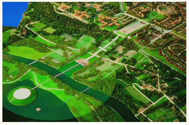 Au départ il s’agit d’une sorte de piste d’aérodrome et c’en est une d’une certaine façon, du moins une piste d’envol. L’axe majeur prend sa source dans le « Grand Palais Blanc » se situant en amont et ceinturant un obélisque incliné et pointant sur l’étoile de Vénus : il émet un rayon laser visible de nuit et qui pointe sur l’arche de la Défense formant ainsi un axe tracé dans le ciel. Mais ce jet de lumière et également accordé aux 12 colonnes comme les 12 apôtres qui plongent jusqu’à 1500 mètres sous terre afin d’y puiser les sources d’eau chaude. L’idée d’alimenter la ville nouvelle avec cette énergie a été abandonné car les eaux sont corrosives mais l’on comprend bien que le projet était d’accorder dans une harmonique mystérieuse (en fait une fréquence connue) la faisceau énergétique avec les sources telluriques créent de fait un vaste champ d’onde de forme émis en direction de la Défense et passant en tourbillon sous l’Arche de la Défense. Cette immense énergie est aussi connue comme « les veines du dragon ». Elle aboutit sur la pointe de la pyramide du Louvre pour s’inverser ensuite.