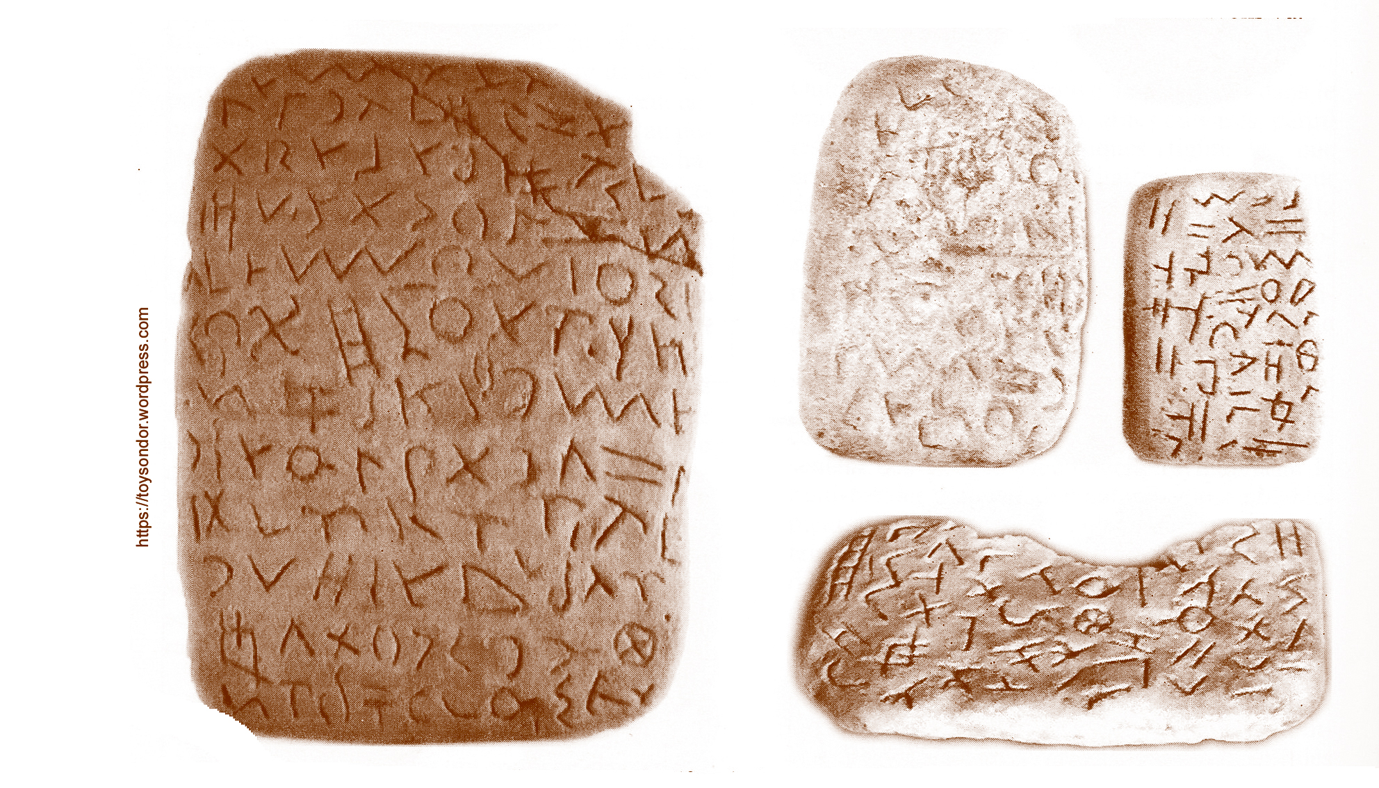 Ce sont les Celtes de la culture de Golasecca en Italie septentrionale, dans le Piémont et la Lombardie – prédécesseurs directs des Insubres – qui avaient adapté un alphabet étrusque du Nord pour enregistrer les premiers une langue celtique à la période de Hallstatt au VIle siècle av. J.-C. A la période de La Tène, à partir du Ve siècle av. J.-C., les Lépontiens écrivaient leurs textes dans un alphabet apparenté, qualifié de lépontique ou alphabet de Lugano. Les Gaulois immigrés du centre de la Gaule empruntèrent l’alphabet lépontique aux Lépontiens et formèrent pour leur langue gauloise un alphabet gaulois cisalpin. Entre la Gaule cisalpine et la Gaule transalpine s’instaura par la suite un échange culturel, dont une première manifestation fut l’importation des alphabets lépontique et gaulois cisalpin en Gaule et donc à Glozel. En ce qui concerne la Gaule, on connaît une certaine quantité d’inscriptions, dont l’origine devrait être un alphabet étrusque du Nord, et qui montrent de grandes similitudes avec les signes de Glozel. On connaît bien les textes sur pierre de Cluzel, Palissard, Montcombroux et Montmarault dans l’Allier, et il y a l’inscription de Carpentras en Vaucluse sur une plaque de plomb.