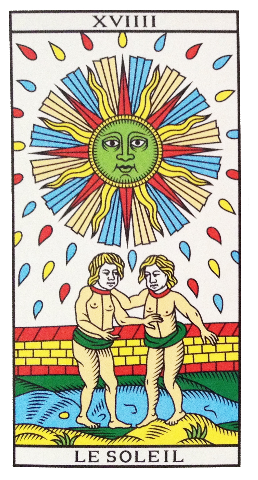 Il est surprenant de constater que malgré plus de 4000 ans le Tarot ait pu conserver l’antique message. A quoi cela tient-il ? sans aucun doute au fait que ce dernier n’était plus perçu comme tel, les cas où les cartes se trouvent altérées sont la plupart du temps celles qui prêtaient à une confusion de sens mais nous avons rétablir dans sa lumière le code des origines ! Ici l’arcane XVIIII nous montre un des aspects de la théogonie égyptienne à savoir les larmes d’Horus surplombant deux lutteurs.