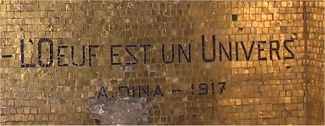 D’où vient cette conception de l’Univers comme un œuf ? en fait il suffit de se reporter aux travaux astronomiques laissés par Assan Farid Dina qui sont très contemporains de la vision astronomique en vigueur de nos jours pour en comprendre toute la portée. Nous allons en donner quelques extraits à partir des archives du fond Dina, le reste est expliqué dans l’ouvrage référencé ici. Il vous expliquera qu’il existe bel et bien un code pour décrypter l’ordre d’apparition des arcanes dans la chapelle, code resté secret jusqu’à aujourd’hui, il vous permettra de prononcer le nom originel AUM.