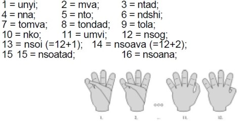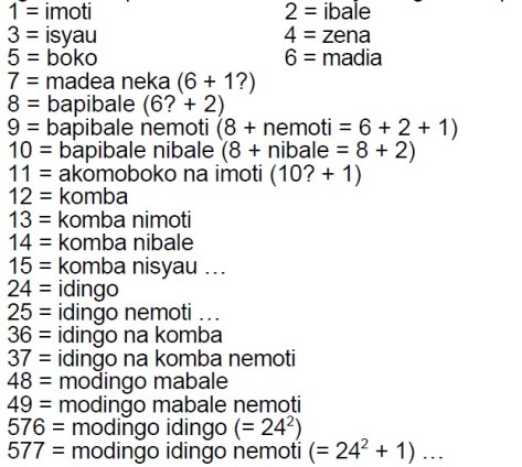 En Afrique, la base 10 semble généralement être le plus souvent utilisé, mais créativité africaine se retrouve dans la multitude d’autres façons de compter. Certains peuples préféraient une base 24 ; dans ce système le 10 devient 24, et le 100 = 10×10 est donc 576 = 24×24. Les Yorubas du Nigeria utilisent la base 20, tandis qu’en Afrique du Sud une variation sur la base 2 était employée. D’autres peuples utilisaient la base 6, d’autres encore un mélange de 6 et 4, ou même une base 32. Jusqu’à ce jour, on “découvre” encore de nouvelles façons. Voici par exemple le système Baali, les points d’interrogation indiquant des mots dont l’étymologie n’est pas certaine :