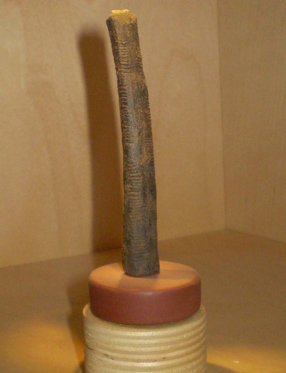 ntimètres. Après quelques essais de datations qui portent son âge sur 8500 ans, des études approfondies montraient plus tard que cet objet date d’il y a environ 20.000 ans. Les spécialistes en zoologie de la préhistoire ignorent encore de quel animal cet os pourrait provenir. La thèse qu’il s’agit d’une phalange d’un lion est mentionnée dans certaines sources, mais elle n’est pas confirmée par aucun spécialiste de l’Institut Royal des Sciences Naturelles. L’objet est devenu comme un morceau de verre, et quand on le frappe légèrement, il produit un son semblable.