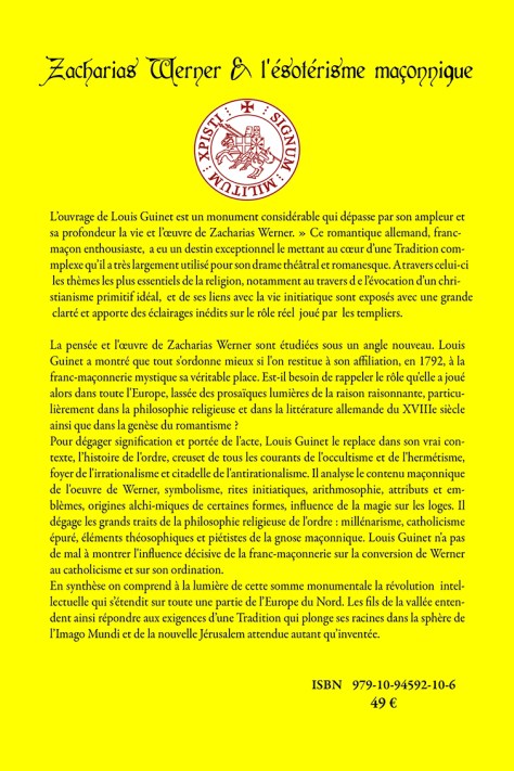De Troyes à Jérusalem, l’odyssée vers l’Orient. L’ouvrage de Louis Guinet est un monument considérable qui dépasse par son ampleur et sa profondeur la vie et l’œuvre de Zacharias Werner. » Ce romantique allemand, franc-maçon enthousiaste, a eu un destin exceptionnel le mettant au cœur d’une Tradition complexe qu’il a très largement utilisé pour son drame théâtral et romanesque. A travers celui-ci les thèmes les plus essentiels de la religion, notamment au travers de l’évocation d’un christianisme primitif idéal, et de ses liens avec la vie initiatique sont exposés avec une grande clarté et apporte des éclairages inédits sur le rôle réel joué par les templiers.