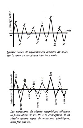 On savait déjà que le cycle biologique est de 28 jours chez l’être humain, ce qui correspond exactement à la durée de rotation du soleil mesurée depuis la terre. Il devenait clair, désormais, que le rayonnement solaire détermine non seulement la personnalité mais le comportement de l’organisme après la naissance : le rayonnement du soleil, par l’intermédiaire des ceintures de Van Allen, module le champ magnétique et agit sur le corps pinéal, ordonnançant la production de mélatonine sur une période de 28 jours.
