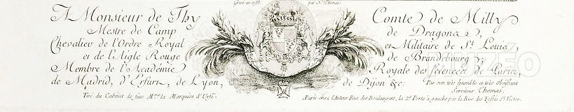 Il est attesté que c’est en 1783, soit 7 ou 8 ans après la mort de la marquise, que Nicolas Thomas (né vers 1750 – mort vers 1812), graveur, va donc créer l’estampe, a priori sur la base donc d’un tableau à l’huile (disparu depuis). Ce ne serait donc pas à la demande de la marquise que cette estampe aurait été gravée. On sait par ailleurs que cette estampe est « dédicacée » au comte Nicolas-Christiern(e) de Thy de Milly (1728-1784) qui est à ce moment grand-maître de la fameuse Loge des Neuf Sœurs (à laquelle il appartenait depuis 1779), loge maçonnique très influente au cours de ces années pré-révolutionnaires. Bref vénéralat, puisque, intronisé vénérable en 1783, il est remplacé dès le mois de mai 1784 et meurt le 17 septembre 1784. On voit cette dédicace au bas de l’estampe mais cette partie est rarement incluse dans les reproductions.