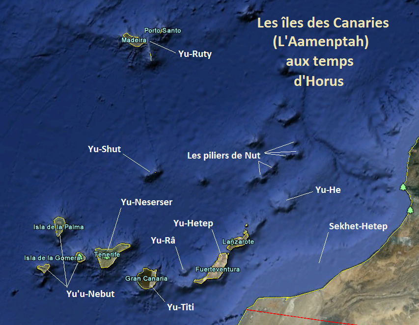 La carte ci-dessous, montre une hypothèse de positionnement des îles mythiques aux Canaries, selon le texte du temple d’Edfu, sur les sources du livre d’Anton Parks (le testament de la vierge). Il est à prendre en compte le fait que la carte est une représentation actuelle (prise sur Google Earth, coordonnées GPS : 28°36’15.83″N 15°43’38.74″W), et que le niveau de la mer devait être beaucoup plus bas, il y a 10 000 ans, juste avant la fonte des glaces de l’ère glaciaire, sans parler des cataclysmes qui auraient pu modifier la configuration des îles.
