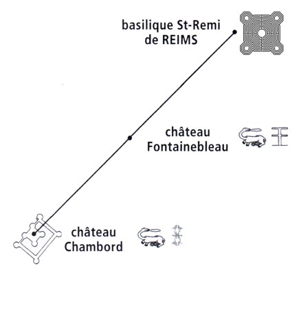 — Il y a Fontainebleau, l’autre demeure aimée de François 1er, et surtout Reims. La basilique de Saint-Remi, lieu saint entre tous puisqu’il conserve les reliques de saint Remi qui a couronné Clovis le premier roi des Francs. J’ai méticuleusement étudié les trois sites : Chambord, Fontainebleau et Reims. Eh bien, ils sont alignés sur la même droite !