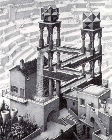 Le courant de l’eau du dessin d’Escher qui tombe de la chute est le rayon de lumière, et le courant qui circule dans l’aqueduc la force gravitationnelle.