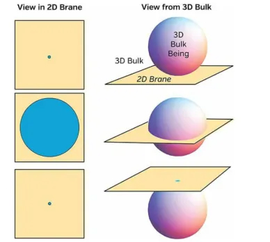Pourquoi cela ? Le principe est résumé sur le schéma ci-dessous. Imaginez que vous n’êtes rien d’autre qu’un carré qui vit sur une feuille de papier. Une vie modeste et ascétique, n’est-ce pas ? Un jour, un point bleu apparaît sur votre feuille, il grandit et devient un cercle, puis rétrécit, redevient un point, et disparaît. Etant un carré plus intelligent que la moyenne, la seule solution raisonnable, à vos yeux, est que vous venez d’être visité par un être qui vit dans un monde contenant une dimension supplémentaire.