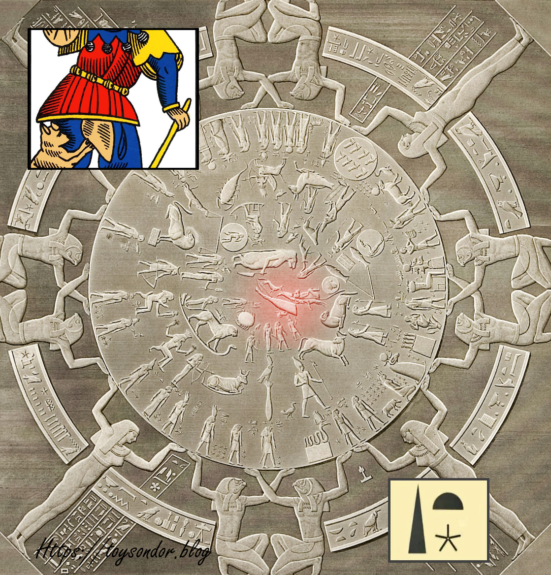 La carte du Mat et l’appel de Sirius : le petit chien (canicula est associé aux journées caniculaires et aux chaleurs qui l’accompagnent). La mat nous présente un petit chien qui tente de mordre la cuisse du marcheur : c’est la cuisse du bœuf où selon la cosmologie égyptienne va se ressourcer Osiris en vue de sa nouvelle naissance. On le retrouve dans le zodiaque de Dendérah exactement dans la même position, le chien Sirius est identifié à la petite ourse tandis que la cuisse nous renvoie à la grande ourse.