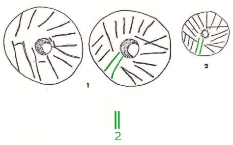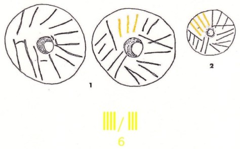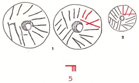 Si nous examinons le signe 1 en partant des bords extérieurs et en procédant dans le sens inverse des aiguilles d’une montre, nous voyons sur les deux fusaïoles une ligne horizontale dont partent trois lignes « parallèles » (c’est-à-dire qui ne se croisent pas). La raison pour laquelle la similitude fondamentale entre ces deux représentations de ce signe n’avait jamais été vue auparavant est simplement une suranalyse. C’est notamment le cas de la classification des signes par Winn, qui a été assistée par ordinateur. Les ordinateurs peuvent être programmés pour démonter les choses très bien, mais il leur manque la perspicacité humaine qui nous permet de comparer les parties avec le tout et d’arriver à des conclusions appropriées.