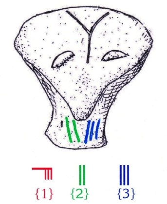 Par exemple, nous avons Pločnik Il s’agit très clairement de la tête ou du masque d’un ours – il a les oreilles d’un ours, le visage d’un ours et les yeux d’un ours. De chacun de ces yeux partent trois lignes, symbole religieux d’une divinité que l’on retrouve sur un grand nombre de têtes différentes, y compris humaines. Entre la forme de la tête et les lignes rayonnantes des yeux, nous savons qu’il s’agit d’une image de la Déesse Ourse, et qu’il n’est pas nécessaire d’écrire. Heureusement pour nous, la personne qui a réalisé cette figurine a ajouté une redondance dans la position des « sourcils ». Sur le côté droit, nous voyons une indication claire de notre signe {1}, et sur le côté gauche, nous avons un autre signe, à l’envers {1}. Le fait qu’il soit à l’envers ne devrait pas nous déranger, puisque l’écriture primitive a tendance à aller de gauche à droite ou de droite à gauche sans cohérence apparente, ou même à procéder « boustrophédon » (d’avant en arrière) sur une plaque, avec les signes eux-mêmes parfois inversés et parfois non.