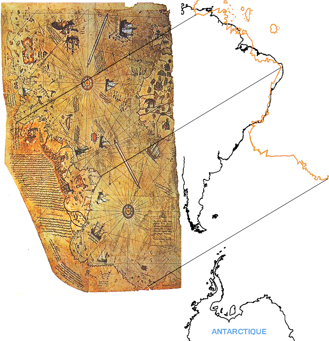 Il y a treize mille ans lors du « Dryas récent » un cataclysme s’est produit qui ne fut pas sans conséquence : de brillantes civilisations disparurent et l’humanité régressa prodigieusement jusqu’à en oublier ses fondamentaux qui ne survivèrent que sous forme de bribe, mythes et légendes. Cet évènement fut à l’origine du mythe de l’Atlantide – qui n’en n’est pas un ! – comme de la disparition brutale des mammouths laineux en Sibérie et de biens d’autres phénomènes que nous commençons seulement à découvrir et à comprendre. Commençons par cette carte de l’amiral Piris Reis qui nous montre au XVIème siècle le 6 ème continent mais sans la glace qui le recouvre sous une épaisseur de 2 à 4 kms !