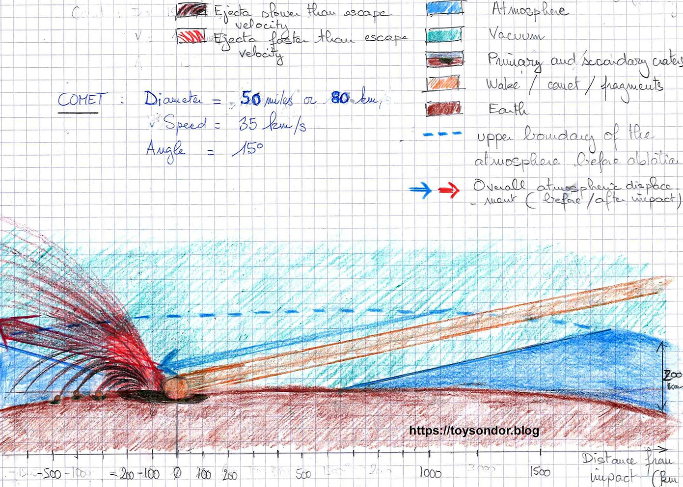 La faible profondeur des cratères, comparée à leur largeur et leur longueur, laisse à penser que les objets d’impact n’étaient pas constitués de roche solide (météorites) mais plus probablement de « boules de neige sales » (matériaux cométaires) et que leur angle d’impact était serré. En effet, l’angle et la nature du bolide influent directement sur la forme du cratère. Une météorite/masse rocheuse se déplaçant sur une trajectoire verticale créera un cratère rond et profond, tandis qu’un fragment cométaire « léger » frappant la Terre en « contre plongée » créera un cratère superficiel étiré (elliptique).