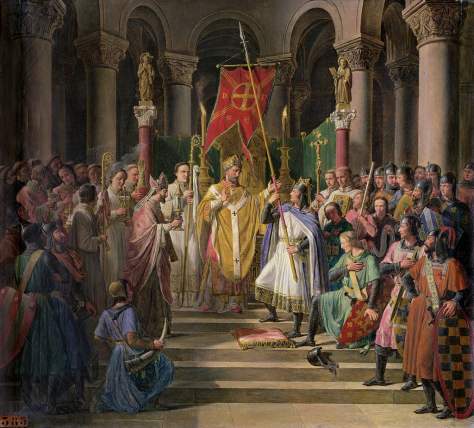 Il y a la ferme volonté pour Suger de rejoindre l’héritage de la grande période carolingienne et la légitimité qu’elle confère. Saint-Denis, la « maître abbaye » comme ses contemporains la nomment, est le centre nouveau et récent de la Chrétienté qui a translaté depuis le Saint-Empire. L’art est le moyen d’en acter la réalité. Des références architecturales parmi lesquelles l’abbé trouve matière à développer sa vision, il y a celles capables de relier l’œuvre des Capétiens à celle de leurs prédécesseurs. Georges Duby en décrit les modalités : « Suger va choisir d’associer à la formule carolingienne véritablement franque de son abbaye les formules aquitaines et bourguignonnes. » Il signale ainsi l’accroissement du royaume chéri et la participation des différents territoires à son processus d’intégration. Et lorsque les vassaux du souverain sont, à Saint-Denis, réunis, la « maître-abbaye » doit faire resplendir l’autorité du roi de France, sa supériorité par rapport à eux, et convenir à la solennité et l’importance des cérémonies qui s’y déroulent, qu’elles soient d’ordre militaire (réunion de l’ost) ou rituelles (dépôt des attributs royaux auprès des tombeaux). La réunion des entités territoriales dans le royaume de France, l’union de leurs peuples dans la nation naissante, Suger souhaite donc le célébrer aussi dans « son » Saint-Denis. Même si un empire n’a pas la même vocation qu’une nation, le souvenir carolingien que cultive Suger est particulièrement présent à Saint-Denis avec Charles le Chauve. Le roi (843-875) puis empereur (875-877) de la prestigieuse dynastie, en fut nommé abbé, en tant que laïc, en 867. Apparu à un moine de Saint-Denis après sa mort, ses restes seront mis dans un tombeau de la nécropole. L’abbaye fête avec pompe son anniversaire, comme celui de Dagobert Ier et Louis VI – Suger réclamera d’ailleurs une telle faveur du chapitre général. Charles II est une figure de la construction du royaume. Le clerc qui en forge l’âme souhaite faire de sa basilique un monument reflétant son intégrité dans le temps, et dans l’espace. Le rassemblement des artisans d’Aquitaine, du Midi, les champions du roman, avec ceux de « l’esthétique austrasienne*L’Austrasie (« royaume de l’Est ») était la partie nord-est de la France, issue du partage des fils de Clovis à la mort de ce dernier. » de la Bourgogne et de la Meuse, forme ainsi cette alliance des peuples de France.