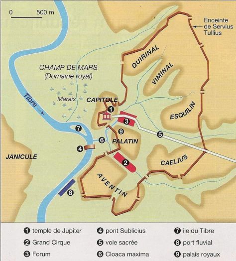 Lorsqu’on remonte aux origines, l’on constate que l’emplacement de la Ville Eternelle fut d’abord occupé, suivant une règle universelle, par une poussière de petites communautés autonomes, dont chacune possédait son foyer religieux spécial, qui était pour elle à la fois son réduit de défense, son arx ou citadelle, et l’omphalos du monde, le point d’où le mana surnaturel, c’est-à-dire la matière dynamique invisible, s’irradiait sur le territoire et sur les membres du groupe. Au Villème siècle avant notre ère, on aperçoit ainsi de minuscules collectivités : sur le Quirinal, occupé par des Sabins, – sur le Viminal (= colline du saule) qui formait une annexe du Quirinal, – sur l’Esquilin dont les trois hauteurs (le Fagutal, ou colline du hêtre, l’Oppius, et Cispius) étaient chacune le centre de petites sociétés distinctes, – sur le Coelius, qui s’appelait alors le Querquetual, ou colline du chêne, et où se situait un village agrégé à la fédération albaine, – sur la Velia, qui prolonge le Palatin vers le nord, et où se trouvait établi un autre village, agrégé à la même fédération, – sur le Palatin dont les deux sommets, le Germal et le Palatual, servaient de résidence à deux petits groupes primitivement distincts, agrégés par la suite en une unité fédérative ressortissant à la tribu des Ramnes, mais qui figurent encore séparément dans la ligue septimontiale. Cette ligue fédérait : a) les deux communautés du Palatin, b) la Velia, c) les trois communautés de l’Esquilin, et d) la communauté résidant sur la partie occidentale du Querquetual ou Coelius ; cette dernière région s’appelait Sucusa (l’on parle parfois ici, à tort, de la Suburra, qui formait, aux temps historiques, non un mont, mais une dépression, entre le Quirinal et l’Esquilin) : les Sept Monts primitifs de Rome ne sont donc pas ceux que l’on croit en général.
