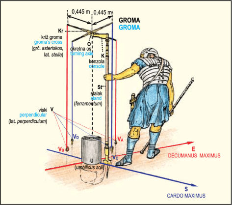 - Le tracé d’un axe perpendiculaire, le cardo maximus, puis d’un carroyage de cardines et de decumani secondaires, parallèles aux axes et destinés à devenir les rues de la ville.
