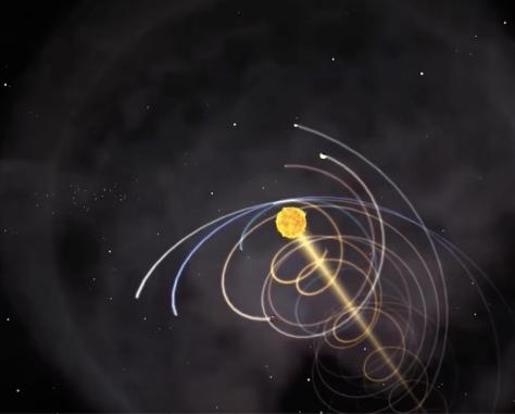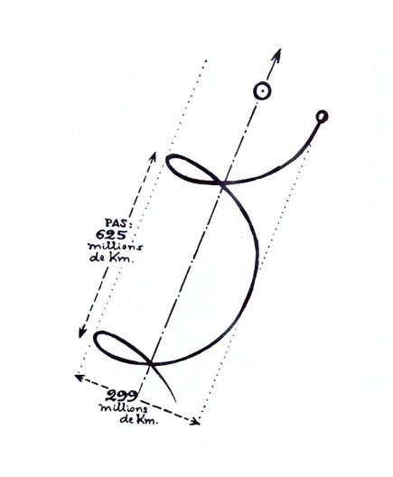 Merveilleux accord entre le monde des idées et celui de la manifestation sensible : quelle plus belle image en effet pourrions-nous trouver de la Spirale du Temps que la trajectoire parcourue en réalité dans l’espace interstellaire par notre Terre elle-même ? Décrivant une ellipse autour du soleil en 365 jours 1/4, nous sommes en effet entraînés en même temps par le même soleil vers l’Apex, point de la Galaxie situé près de Véga de la Lyre, et vers lequel l’ensemble du système solaire se dirige à raison de 19,5 km à la seconde (ce qui est d’ailleurs une vitesse très faible au regard des vitesses habituelles des étoiles). Ainsi, notre planète décrit dans l’espace une gigantesque hélice d’un diamètre de 299 millions de km et d’un « pas » de 625 millions de km, chemin parcouru par le soleil en une année de 365 jours 1/4.