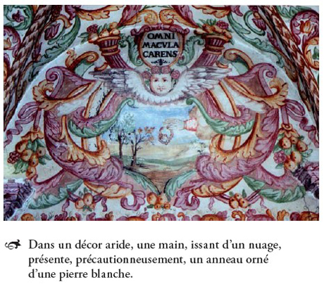 L’anneau de Cimiez aurait pu symboliser une alliance de ce type, éternelle et indissoluble. Mais la sentence préfère souligner la pureté du diamant. Elle évoque donc plutôt « la Vierge sans tache » ainsi que Marie fut expressément désignée. De fait, cette interprétation s’accorde parfaitement avec la thématique donnée par le plafond.