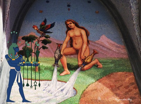 Telle une résurgence des eaux tombées sur la tête de Shiva voici que jaillit une source de la cuisse gauche d’Osiris; au déversement du fleuve céleste et à sa fin dans le premier dieu répondent le surgissement du fleuve terrestre et sa naissance du second. Là, le mouvement est descendant et se traduit par une déperdition: les eaux objet de la formidable chute depuis la Voie lactée perdent de facto leur nature galactique; les eaux ne remontent jamais et celles-ci ne sauraient déroger à la loi, elles sont irrémédiablement perdues pour le Ciel. Ici, le mouvement est ascendant et se traduit par un apport : deux jets s’élèvent de la cuisse gauche du dieu et leurs eaux alimentent la crue providentielle. Si le Nil est une lointaine hypostase de la Voie lactée le schéma donne corps à une sorte de communication entre la «perte» du Gange céleste Là-Haut (à la tête) et la résurgence du Nil terrestre ici-bas (à la cuisse).