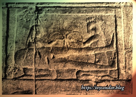 Dans cette illustration on peut voir la partie inférieure du tronc d’Osiris, apparemment émasculé; les jambes sont nettement distinctes l’une de l’autre, la jambe gauche est allongée au-dessus de la jambe droite. Deux jets d’eau s’échappent en demi-cercles symétriques d’un point unique de la cuisse nettement situé au-dessus du genou. Deux personnages agenouillés face à face dans une position également symétrique par rapport à ce point semblent rendre grâce du jaillissement miraculeux de l’eau qui retombe sur leurs bras tendus dans un geste rituel. Il pourrait s’agir d’Isis et Nephthys ou d’Isis et Re, en effet selon Junker «in der Inschrift über der Darstellung wird erzàhlt wie Isis die Seine gefunden habe und mit dieser Nachricht zu Re nach Heliopolis geeilt sei ; da habe der Sonnengott aile Götter aufgefordert, mit ihm nach dem Abaton zu eilen und die Reliquie des Gottes zu bestatten ».