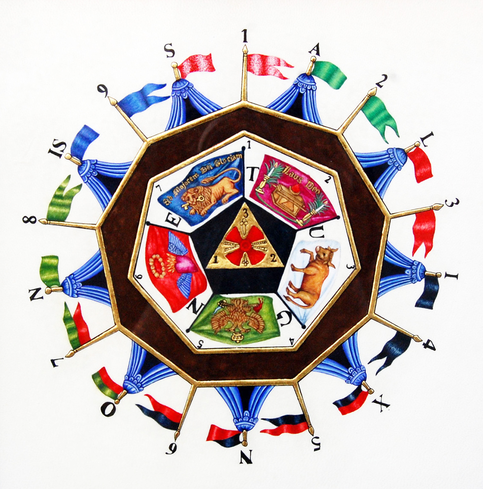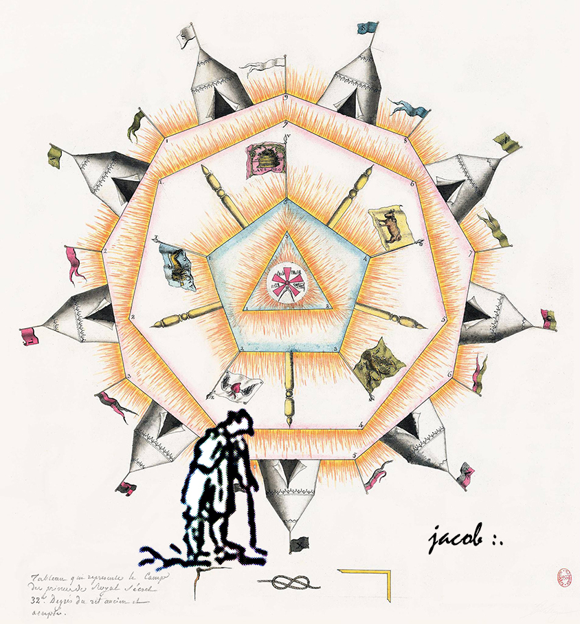 L’Ennéagone représenté sur le Tableau est le camp des Maçons de tous les Grades qui vont être maintenant indiqués. On notera que chaque tente représente un camp complet et que les étendards ou pennons indiquent les différents Degrés de la Maçonnerie et que chacune des lettres qui distinguent ces étendards est issue des Mots dont il est fait usage en ce Sublime Degré. Ainsi le Degré de Rose+Croix. ou de Saint-André, ou encore de l’Aigle Blanc sera signalé par un étendard et des pennons blancs légèrement liserés de rouge et camp de ce Degré sera représenté par la tente S.