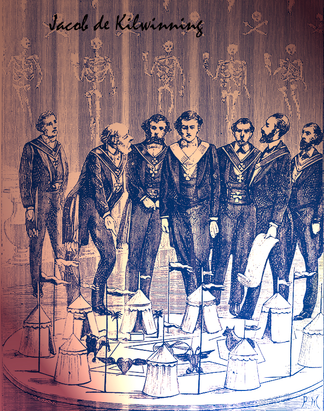 - La troisième tente, notée L appelée Nehemias, a un pennon rouge et marque le camp des Grands Elus Parfaits et Sublimes Maçons.