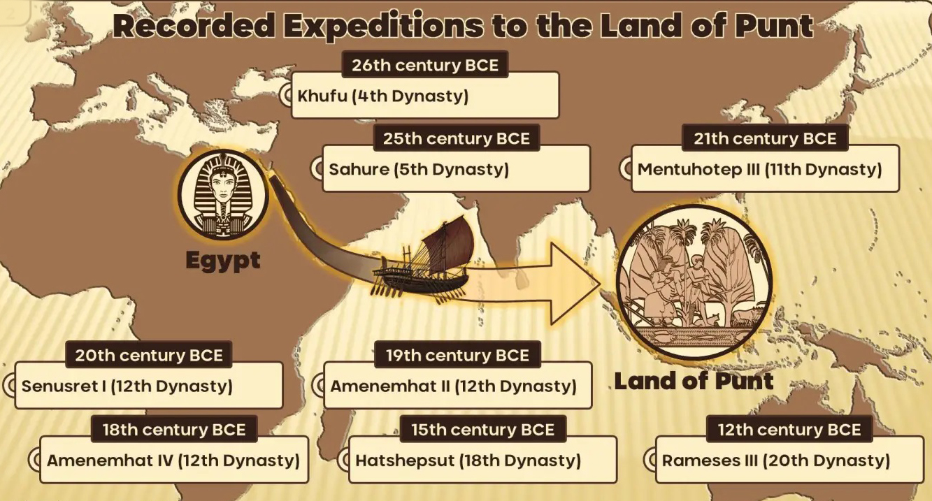 Déjà sous l’Ancien Empire de nombreux papyrus mentionnaient l’existence du Pays de Pount. En effet, sous la Vème dynastie, les égyptiens naviguaient déjà en direction du fabuleux « pays de Pount », mais les échanges devinrent plus réguliers sous le Moyen et surtout sous le Nouvel Empire. Ainsi, de nombreux contes, récits et représentations apparurent.