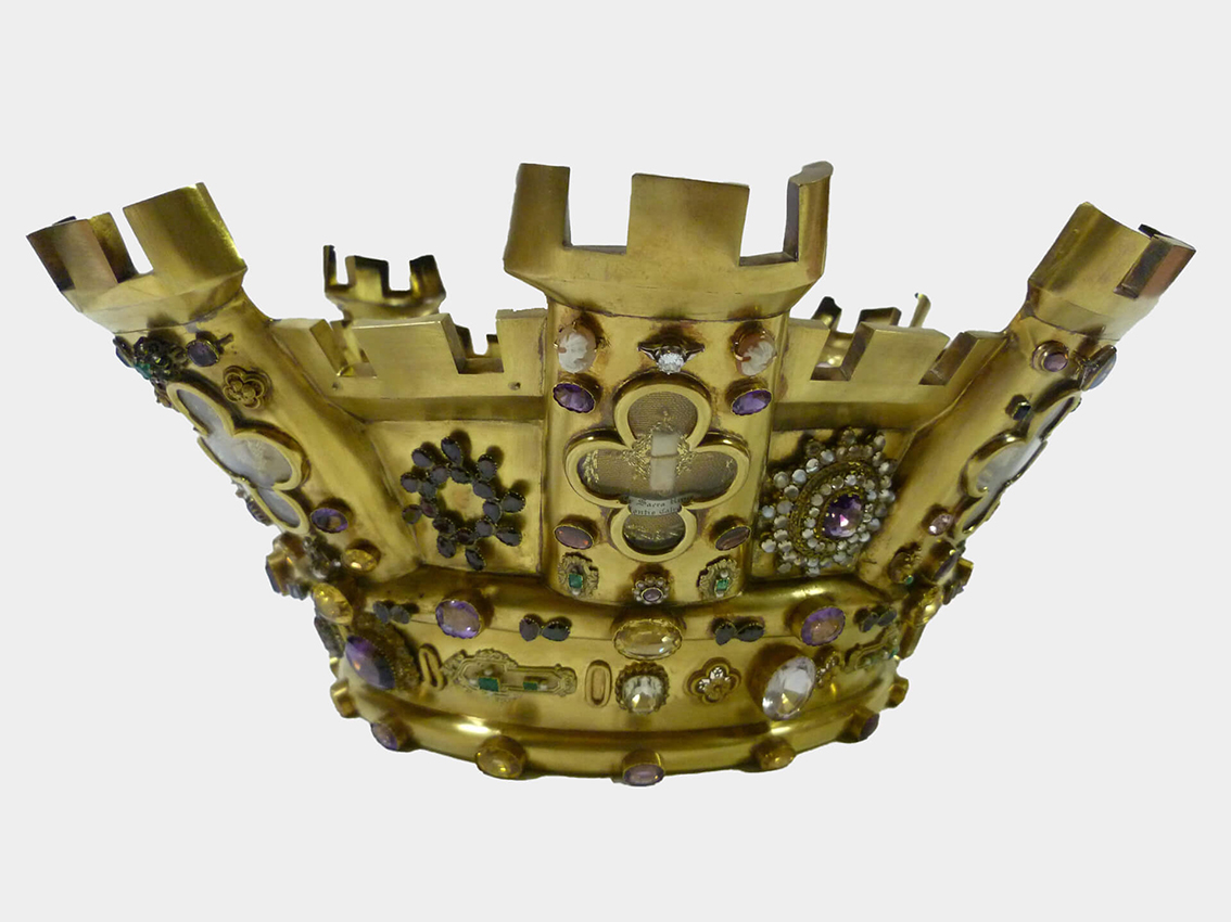 « C’était une couronne murale, analogue à celle qui est généralement employée de nos jours polir timbrer les armoiries des cités urbaines, c’est-à-dire un bandeau métallique, orné de huit tours en saillie. Telle était, d’après les anciens inventaires, la couronne qui fut offerte au héros de la Croisade par ses compagnons d’armes, après la conquête de Jérusalem. On sait qu’il refusa de la porter, ne voulant pas, disait-il, être couronné d’or et de pierreries dans une ville où le Sauveur des hommes avait été couronné d’épines, et qu’il l’envoya sur le champ à sa sainte mère, la comtesse Ide, pour être déposée aux pieds de la Vierge miraculeuse, dans l’église de sa ville natale. C’était, d’après l’Inventaire officiel du mobilier de la cathédrale, dressé par les délégués de la municipalité de Boulogne. le 14 janvier 1791: une couronne de vermeil, entourée de huit reliquaires, » — d’autres textes donnent huit châteaux, ou huit tours — dans lesquelles étaient des reliques de la Terre Sainte. «