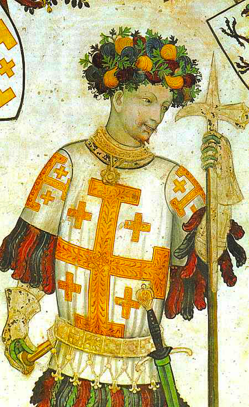 Ses faits d’armes et ses exploits, sont relatés avec beaucoup d’emphase par des chroniqueurs, comme l’Allemand Albert d’Aix ou Guillaume de Tyr, qui contribua avec son Histoire d’Éraclès (XIIe siècle), à la légende du chevalier. Peu de temps après la prise de la ville, Godefroy de Bouillon se voit proposer la couronne de roi de Jérusalem. Il la refuse, arguant qu’il ne peut porter une couronne d’or là où le Christ a dû porter une couronne d’épine. Il consent au titre d’Avoué du Saint-Sépulcre, promettant de protéger la ville conquise et le tombeau du Christ. Il n’en n’agit pas moins en roi en ce qui concerne l’administration et la pacification des terres alentours.