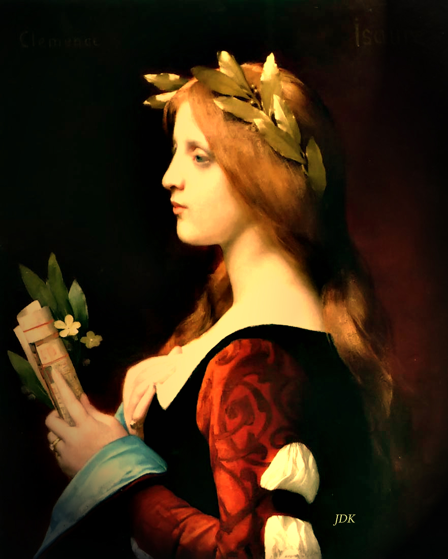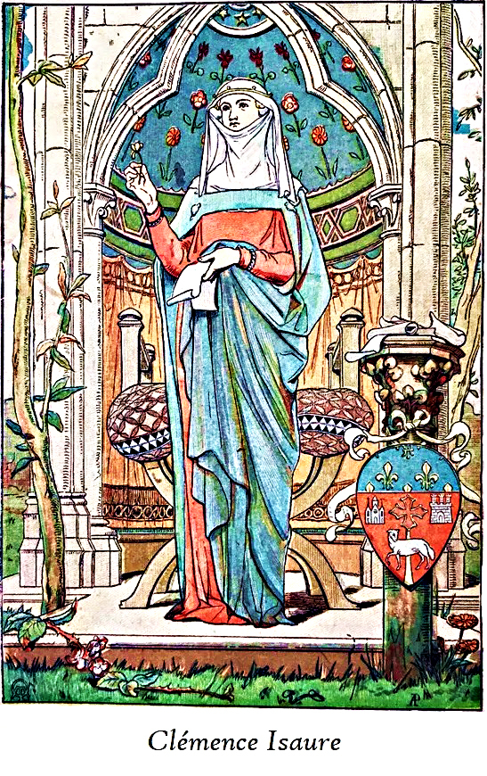 En 1323, sous Charles le Bel, les Sept troubadours avaient créé le Consistoire du GAY SAVOIR (Gay Saber), la plus ancienne Académie d’Europe qui s’attribuait pour mission de récompenser par l’attribution de fleurs les plus belles poésies en langue d’OC… La plus haute distinction était la violette d’or réservée aux poèmes dédiés à la Vierge, Dame Clémence. La première violette fut délivrée en 1324. Le concours perdurant Charles IV très impressionné par le niveau des concurrents encouragea les sept créateurs à développer l’institution. Le concours prit le nom de jeu de l’Amour et d’autres fleurs furent crées à côté de la violette pour récompenser d’autres genres de poésie. La violette d’argent célébrait le genre noble. En 1345 s’y ajouta l’églantine pour des sujets plus variés et le souci d’argent (en latin calendula) pour la poésie légère.