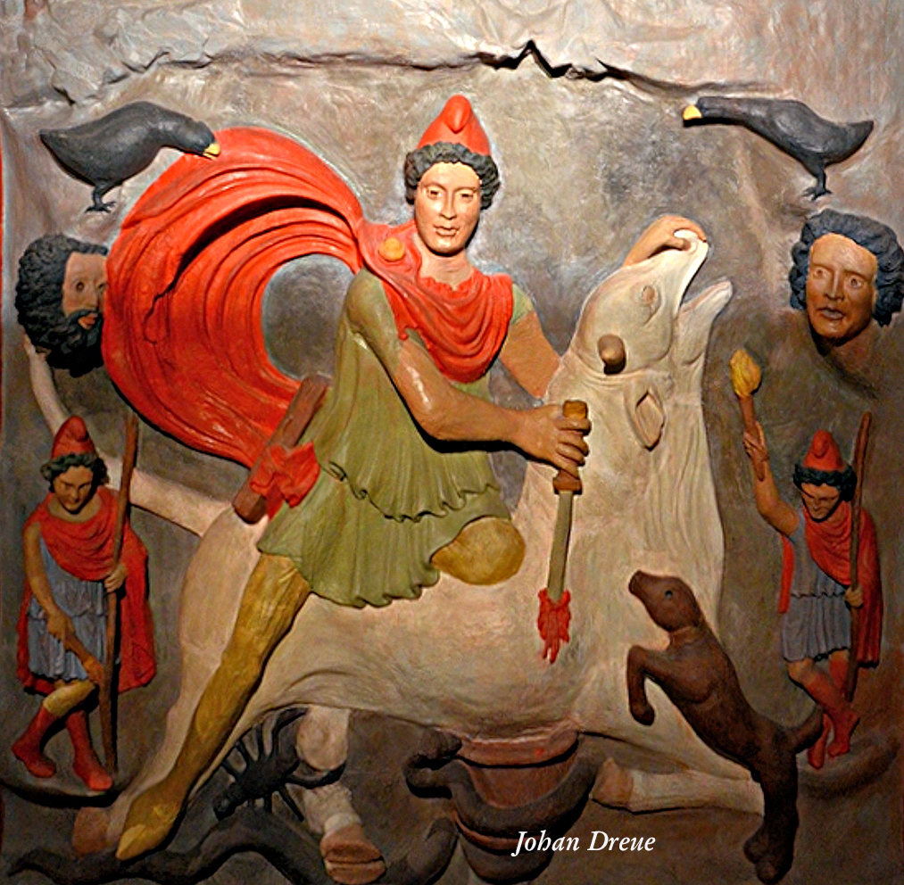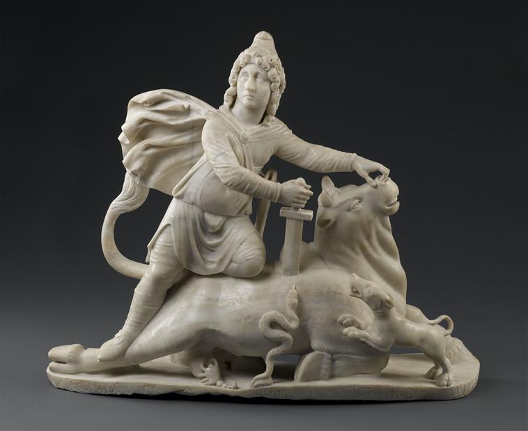 D’après sa légende, il serait né d’une pierre dont il se serait dégagé, la tête coiffée d’un bonnet phrygien. Aussitôt après sa naissance, il rencontre un taureau sauvage. Le jeune dieu le dompte et l’entraîne dans la caverne qu’il a creusée en se dégageant du rocher. Il reçoit alors du soleil l’ordre d’immoler la bête.