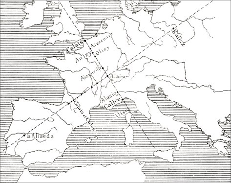 Tout ceci nous reporte certes à un passé fort lointain: les IIIe, IV’ et V’ millénaires de l’Ere antique, et l’on pourrait croire, à priori, que cette étude sur les alésias ne présente plus aujourd’hui qu’un simple intérêt de curiosité, sans plus, mais il n’en est rien. L’«empire» alésien nous paraît en effet fondé sur une science traditionnelle, la Géographie sacrée, dont les principes, d’origine métaphysique, sont valables pour tous les temps. Il suffit d’ailleurs de jeter un simple coup d’œil sur un atlas pour constater que des provinces fort éloignées l’une de l’autre, mais de noms presque identiques: Galice et Galicie, sont situées à peu près symétriquement par rapport à Alaise, et il en est encore de même pour deux fleuves semblables, l’Elbe et l’Ebre, ces anciennes frontières de l’empire de Charlemagne.