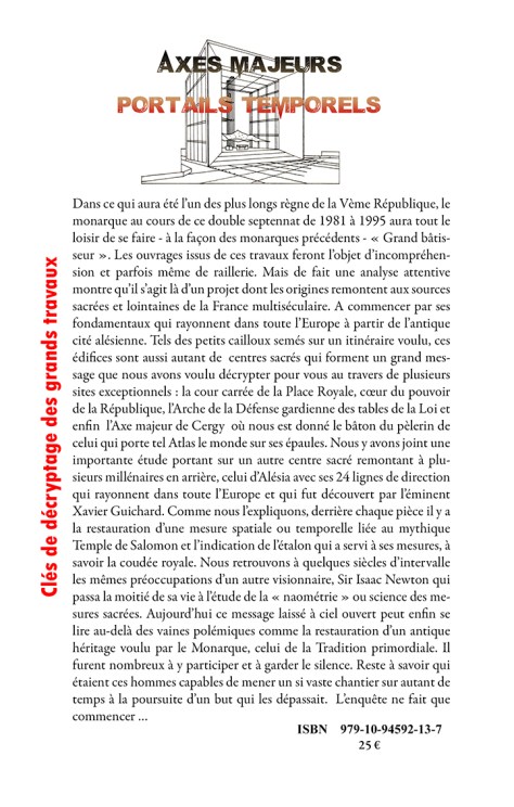Au sommaire : clés des grands travaux et analyse de trois chantiers : l’Axe majeur de Cergy (axis mundi et bâton de St Christophe), la cour du Palais Royal (portail temporel et le passage de Chiron), l’Arche de la Défense et les Tables de la loi.. suivi des quatre axes de la Roue d’Alésia avec ses quatre lignes de direction principales. Il s’agit de la première partie d’un travail qui se poursuivra en 2019.