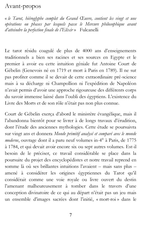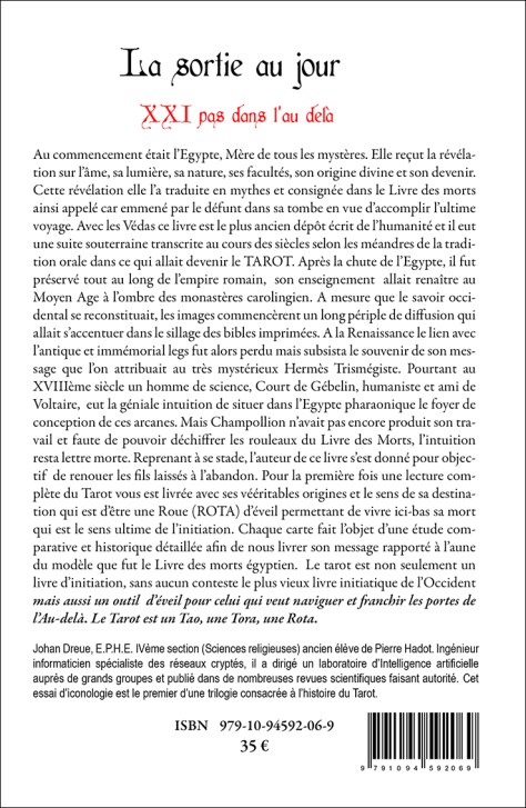 Au commencement était l’Égypte, Mère de tous les mystères. Elle reçut la révélation sur l’âme, sa lumière, sa nature, ses facultés, son origine divine et son devenir. Cette révélation elle l’a traduite en mythes et consignée dans le Livre des morts ainsi appelé car emmené par le défunt dans sa tombe en vue d’accomplir l’ultime voyage. Avec les Védas ce livre est le plus ancien dépôt écrit de l’humanité et il eut une suite souterraine transcrite au cours des siècles selon les méandres de la tradition orale dans ce qui allait devenir le TAROT. Après la chute de l’Égypte, il fut préservé tout au long de l’empire romain, son enseignement allait renaître au Moyen Age à l’ombre des monastères carolingien. A mesure que le savoir occidental se reconstituait, les images commencèrent un long périple de diffusion qui allait s’accentuer dans le sillage des bibles imprimées. A la renaissance le lien avec l’antique et immémorial legs fut alors perdu mais subsista le souvenir de son message que l’on attribuait au très mystérieux Hermès Trismégiste. Pourtant au XVIIIème siècle un homme de science, Court de Gébelin, humaniste et ami de Voltaire, eut la géniale intuition de situer dans l’Egypte pharaonique le foyer de conception de ces arcanes. Mais Champollion n’avait pas encore produit son travail et faute de pouvoir déchiffrer les rouleaux du Livre des Morts, l’intuition resta lettre morte. C’est donc à partir de là que l’auteur de ce livre est parti pour renouer des fils laissés à l’abandon. Pour la première fois le code resté secret du Tarot vous est dévoilé à la lumière de ses véritables origines avec le sens de sa destination qui est d’être une Roue (ROTA) d’éveil permettant de vivre ici-bas sa mort ce qui est le sens ultime de l’initiation. Chaque carte fait l’objet d’une étude comparative et historique détaillée afin de nous livrer son secret rapporté à l’aune du modèle que fut le Livre des morts égyptien. Le tarot est non seulement un livre d’initiation, sans aucun conteste le plus vieux livre initiatique de l’Occident mais aussi un outil d’éveil pour celui qui veut naviguer et franchir les portes de l’Au-delà. Le Tarot est un Tao, une Tora.