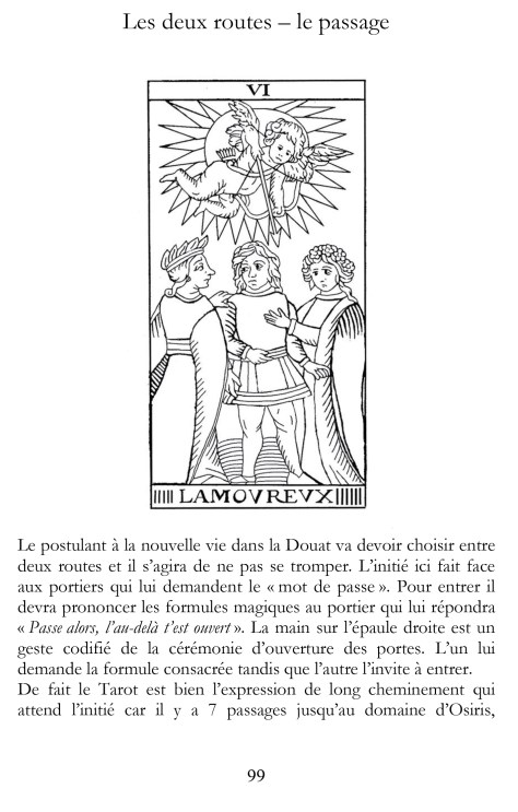 On y découvrira notamment le chiffre du principe féminin porté à sa perfection et les fiançailles d’Osiris et d’Isis à la suite de cette tribulation qui mène du Bateleur au corps glorifié du nouveau couronné, le mort-Roi glorifié dans sa forme parfaite. Au fond le Tarot se révèle être une école de psychostasie, celle des mystères antiques et un outil d’éveil initiatique pour celui qui veut naviguer et franchir les portes de l’Au-delà.