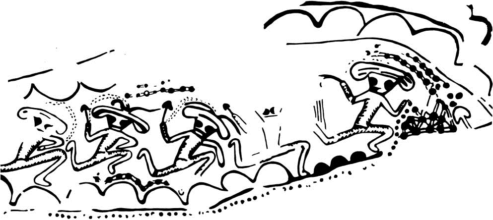 Cette figure impressionnante met en lumière l’un des nombreux problèmes soulevés par les découvertes du Tassili. Pourquoi, si elles ont été réalisées à une époque où la stratigraphie de la vallée du Nil montre qu’elle était presque déserte, de nombreuses peintures de la période des têtes rondes montrent-elles une influence égyptienne indubitable dans leur contenu et leur style ? La conclusion logique est que ces motifs et ces concepts stylistiques que nous associons à l’Égypte ancienne ont d’abord été introduits en Égypte par les habitants du désert occidental. Si elle est prouvée, cette suggestion indiquerait que le Sahara central est à l’origine de ce qui est devenu plus tard la haute civilisation de l’Égypte pré-dynastique. Voir mon livre sur les Shemsou Hor.