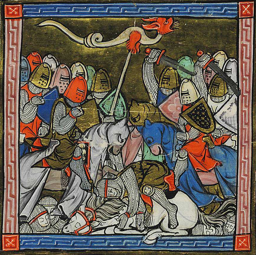 La première bannière militaire des Sarmatiens était un dragon, dont le porteur était appelé le Draconarius, mais cet emblème fut ensuite dérobé par les légions romaines de l’empereur Marc Aurèle à la suite d’une victoire sur les Sarmatians de Hongrie, en 175 apr. J.-C. Peu après, de nombreux captifs furent transportés en Grande-Bretagne où ils furent ajoutés aux forces romaines de Lucius Artorius Castus, devenant ainsi la première unité de cavalerie lourde de l’armée impériale. À la suite du retrait des troupes romaines de Grande-Bretagne, en 410 apr. J.-C., les dirigeants régionaux redevinrent des chefs de clans, et l’un d’entre eux, Vortigern de Powys, était un roi gallois. Ayant assumé le plein contrôle de la région à partir de 418 apr. J.-C., Vortigern fut élu Pendragon de l’Île (Pen Draco Insularis) sept années plus tard. Il réintroduisit dans la bannière le symbole sarmatien, devenu par la suite le célèbre Dragon Rouge du drapeau national du pays de Galles. La liste des pandragons est donné dans notre ouvrage.