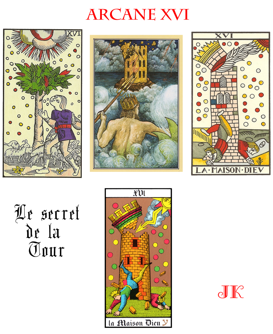 Ce qui frappe tout de suite c’est la carte de Vieville : un berger quitte son troupeau pour recueillir les fruits d’un arbre placé juste sous le soleil. Cette carte aurait pub être « LA » carte désignant l’arcane XVI mais c’est celle de Dodal qui prévalut avec sa tour en feu : pourquoi ? Dans le cadre de notre interprétation et à la lumière des matériaux rassemblés c’est parfaitement cohérent, mais alors comment ? De plus la carte fantaisiste n’ayant fait appel qu’à l’imagination active de son auteur dévoile un autre élément décisif de cette lame : à savoir le dieu Neptune et son milieu marin, quand à la carte de Jean Dodal il est très important de noter qu’il n’y a nul éclair mais bien au contraire une flamme qui s’échappe de la tour pour gagner le soleil. Dans le tarot de Wirth et suite à une rationalisation moderne, la flamme a été retournée pour cette fois descendre du ciel d’où l’idée naturelle de foudre qui l’accompagna (sur-sens et contre sens). L’intention était certes louable mais le résultat désastreux (au sens étymologique) car ainsi le sens de cette carte a été oblitéré, voir perdu pour devenir ce qu’on lui prête désormais, à savoir chute, perte, malheur, ruine etc, etc .. Alors qu’il n’en est rien au départ.