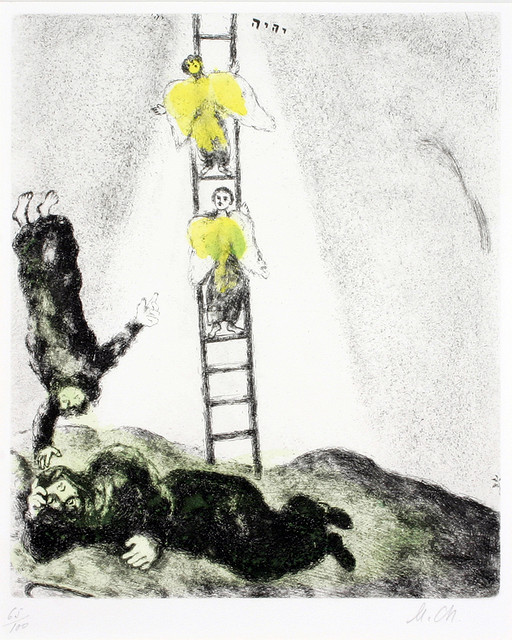 Jacob part pour Haran de Betsabea. Après avoir parcouru une quarantaine de kilomètres, il se sent fatigué. Il s’arrête, il utilise une pierre comme coussin et il s’endort. Il fait un rêve hallucinant d’un escalier trafiqué par des Anges et il subit un long monologue du Seigneur qui lui assure protection et puissance. Impressionné et tremblant il se réveille et il prononce la phrase fatidique: « Ceci est un Lieu Terrible ! En vérité ici est la Maison de Dieu et la Porte du Ciel « . Il enduit la pierre qui lui avait servie d’oreiller et il l’utilise pour en faire une autel en souvenir de la vision. Adroitement, il change le nom de cet endroit, de Luz au Betel et il promet qu’en contrepartie de la divine bienveillance, cet autel deviendra la Maison de Dieu : Beth-El, justement.