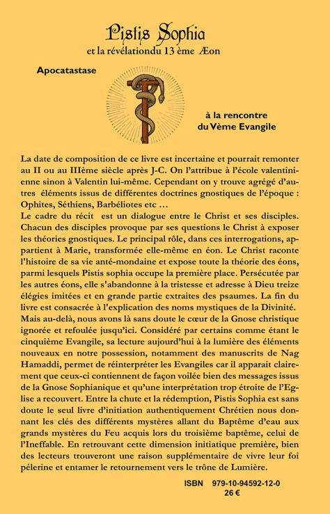 Mais au-delà, nous avons là sans doute le cœur de la Gnose christique ignoré et refoulé jusqu’ici. Sa lecture aujourd’hui à la lumière des éléments nouveaux en notre possession, notamment des manuscrits de Nag Hamadi, permet de réinterpréter les Évangiles car il apparait clairement que ceux-ci contiennent de façon voilée bien des messages issus de la Gnose et qu’une interprétation trop étroite a recouvert. Entre la chute et la rédemption, Pistis Sophia est sans doute le seul livre d’initiation authentiquement Chrétien nous donnant les clés des différents mystères allant du Baptême d’eau aux grands mystères du Feu acquis lors du troisième baptême, celui de l’Ineffable. En retrouvant cette dimension initiatique première, bien des lecteurs trouveront une raison supplémentaire de vivre leur foi pèlerine et entamer le retournement vers le trône de Lumière où règne la Sophia.