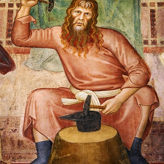 Tubal Cain is mentioned in the book of Genesis as the son of Lamech and Zillah. He is referred to as « an instructor of every artificer in brass and iron » in other words the first smith and the inventor of metal working (metallurgy). The name Tubal Cain plays a prominent part in Masonic rituals as a password.Taken from a 14th century fresco.